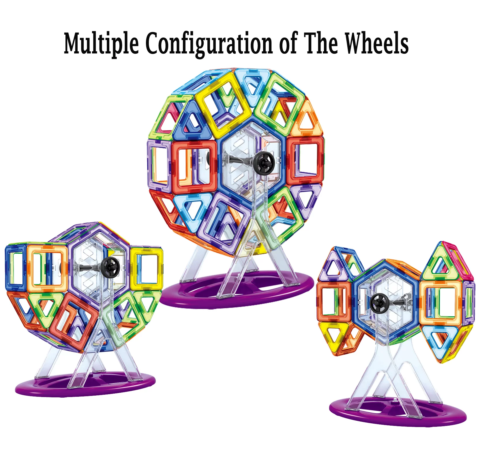 Package Contents total 106 Pcs 20 Magnetic Triangle 24 Magnetic Squares4 Magnetic Long Triangle(Isosceles triangle)2 Magnetic Hexagon 2 Magnetic Semicircle Blocks 2 magnetic Rectangle Blocks2 Wheel sets (not Magnetic) 1 big Ferris wheel set (8 pieces, not magnetic) 42Alphanumeric Cards (not Magnetic) 1 Idea Booklet100 Customer satisfactionWe strive for 100% customer satisfaction . If there is anything you are not happy with the set, contact us and we will replace it for free until you are happy or you money back. Your satisfaction is our pursuit! Please feel free to contact us directly when you encounter any problems. Warning: Contain small parts not for children under 3 year or any individual who has a tendency to place inedible objects in their mouths