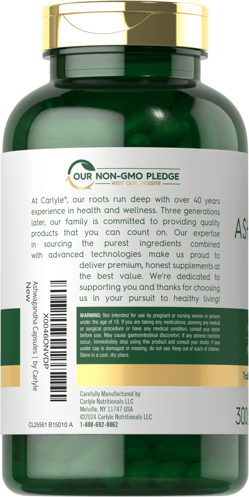 Reap the benefits of this ancient herb with Carlyle Ashwagandha! Inspired by hundreds of years of Ayurvedic tradition, our unique formula features the equivalent of 3,000 Ashwagandha plus 12 mg Black Pepper Extract per serving for additional support. Our formula is gluten-free and non-GMO, making it a perfect choice for men and women looking to add Ashwagandha to their daily routine.