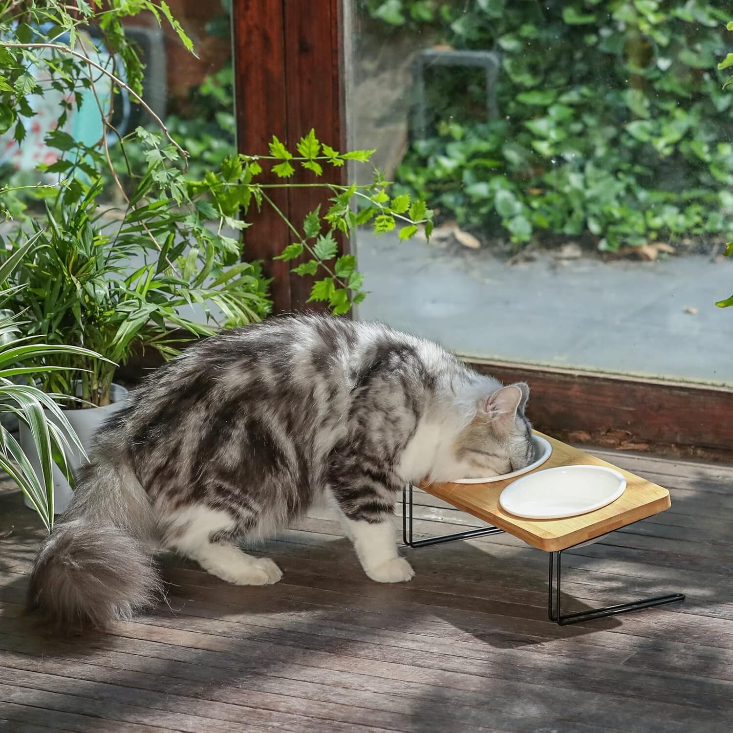 - FOOD GRADE CERAMIC BOWLS – Our bowls are certified 100% safe for pets by SGS, the world’s leading testing, inspection and certification company. Safety information and test results can be download from product detail page. The Ceramic material is sturdy, rust-free and harmless to cats. And the bamboo holder is coated with certified pet safe varnish, which is waterproof and durable.