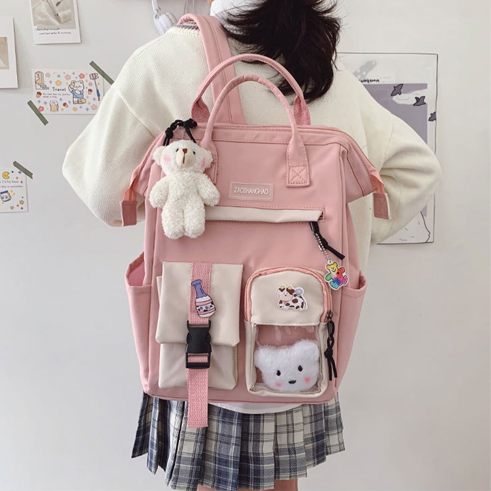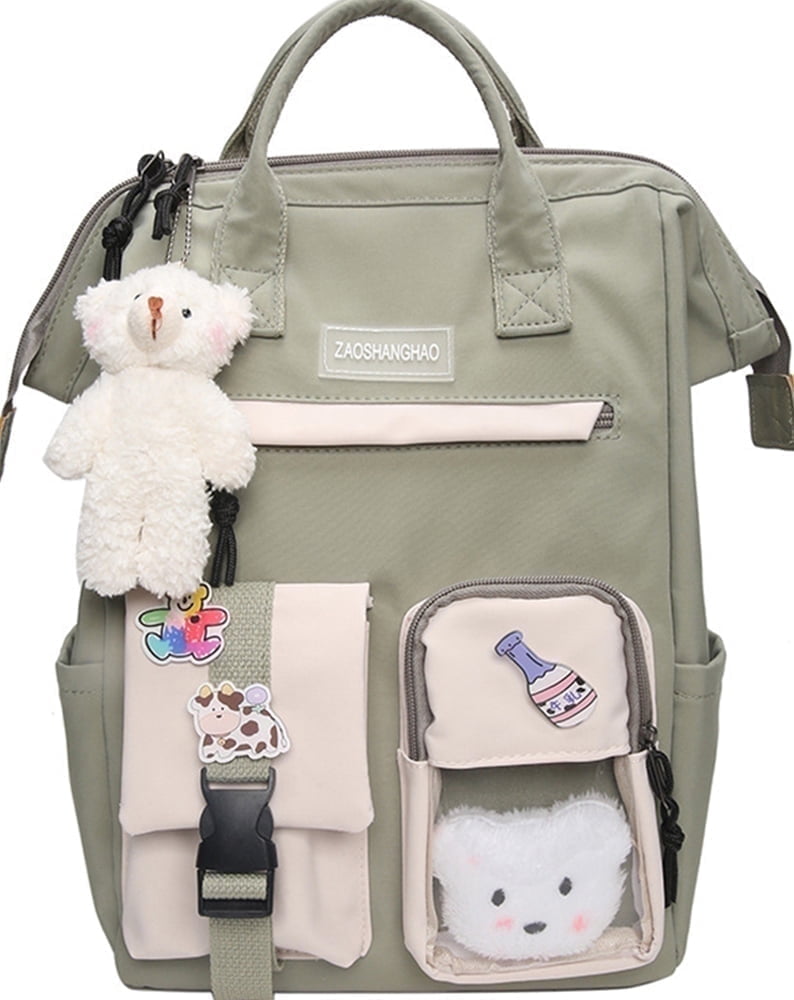 Cute ornaments: There are small white bear ornaments on the schoolbag. There are 3 colors pink, green and purple. Each color is equipped with different stickers, which are more playful and cute.