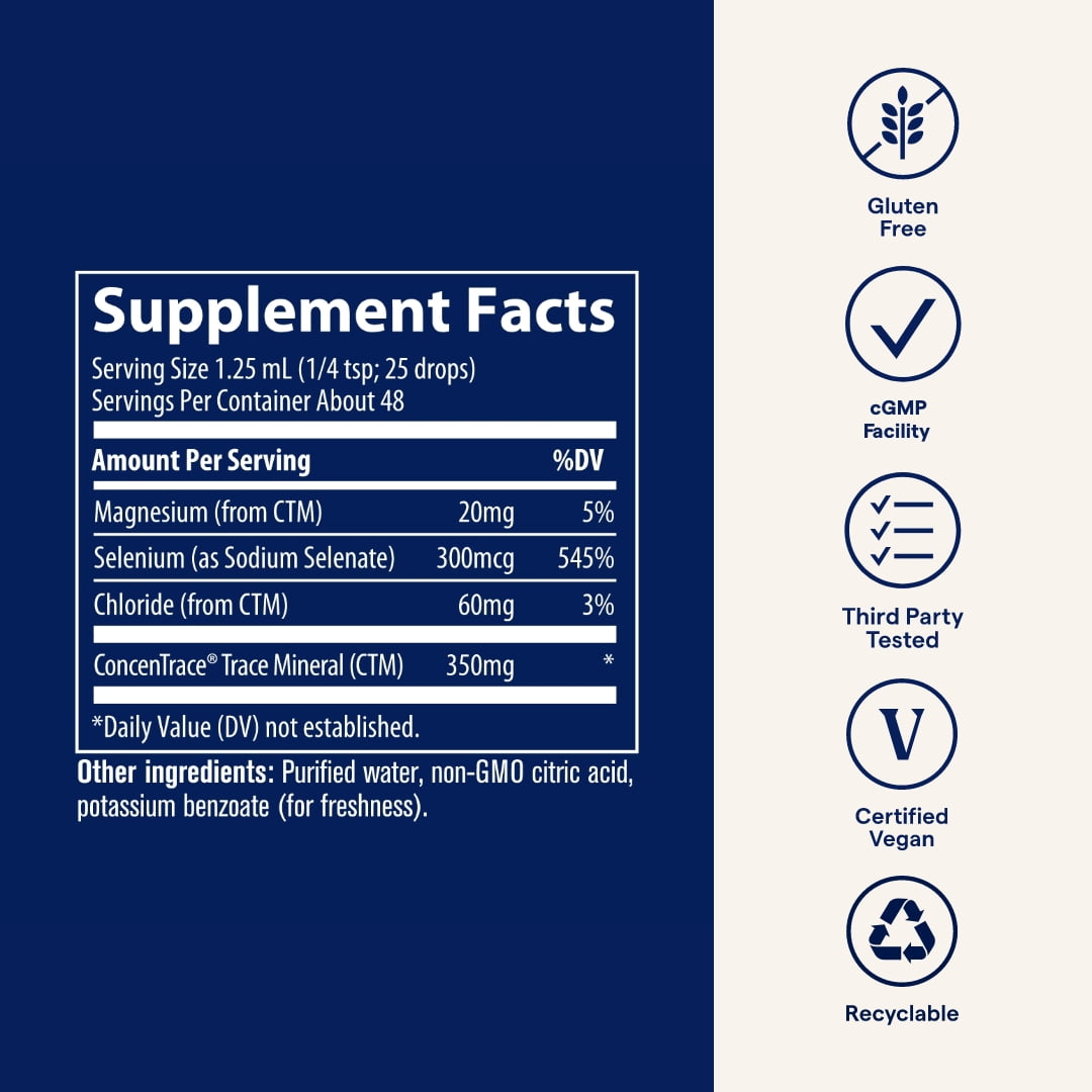 Magnesium (from CTM) 20mg 5%, Selenium (as Sodium Selenate) 300mcg 545%, Chloride (from CTM) 60mg 3%, ConcenTrace® Trace Mineral (CTM) 350mg, Other ingredients: Purified water, non-GMO citric acid, potassium benzoate (for freshness)./div>