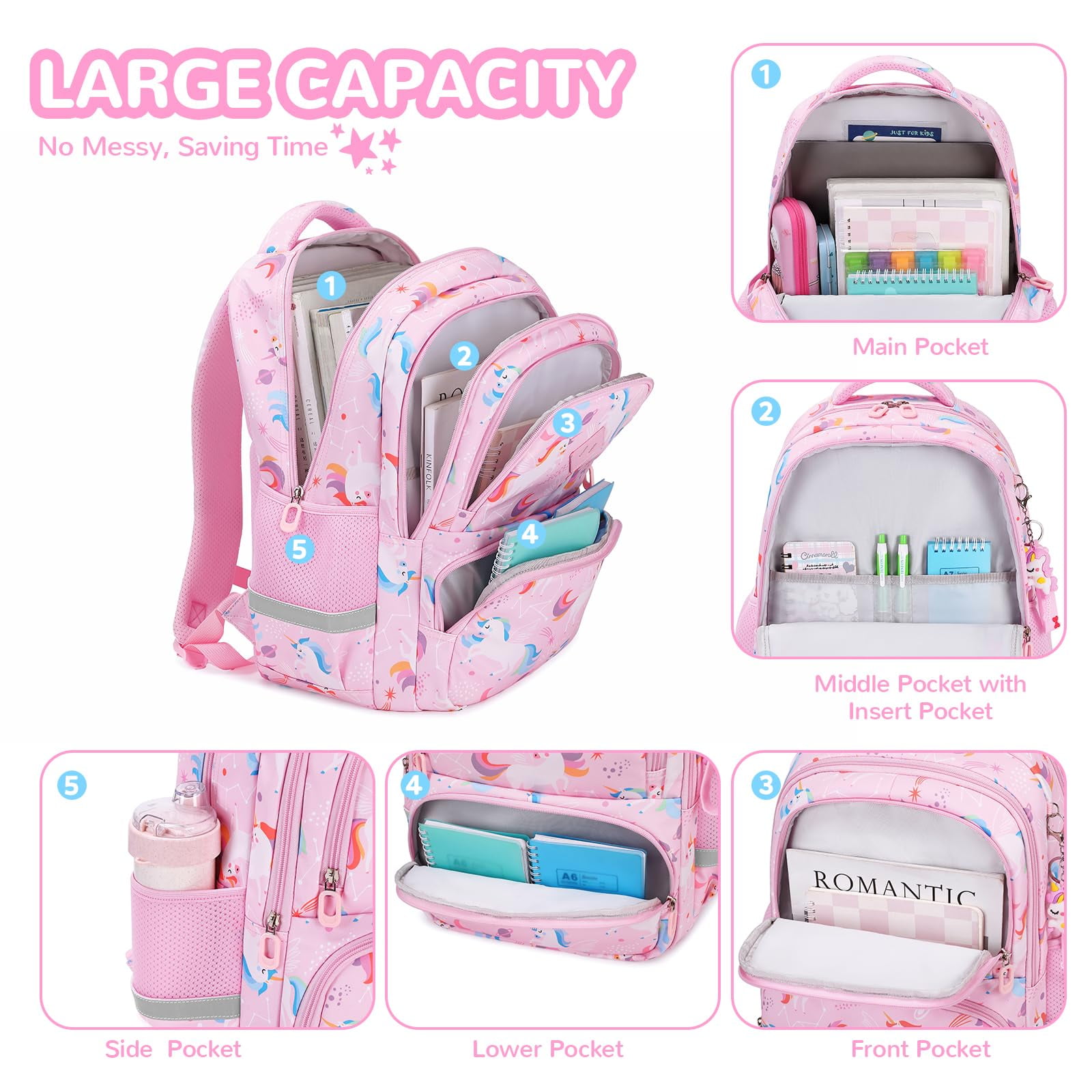 - Multiple Pockets, Well Organized,Saving Time: Mension:16.53INCH(42CM)*13.38INCH(34CM)*5.51INCH(14CM)(HxWxD),A main pocket with thickened computer laptop compartment, one vice pocket with a stationery slots, second vice pocket, a lower pocket,two deep side pockets,our school backpacks have enough space for daily school supplies and helps kids develop the good habit of learning and organizing items and classification