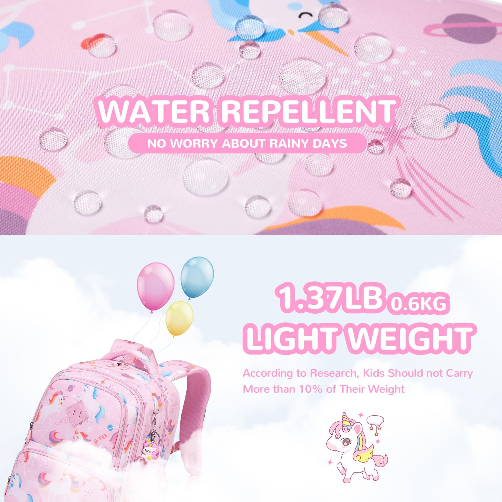 Kawaii Printed School Backpack – Lightweight, Waterproof, Pink Unicorn Design