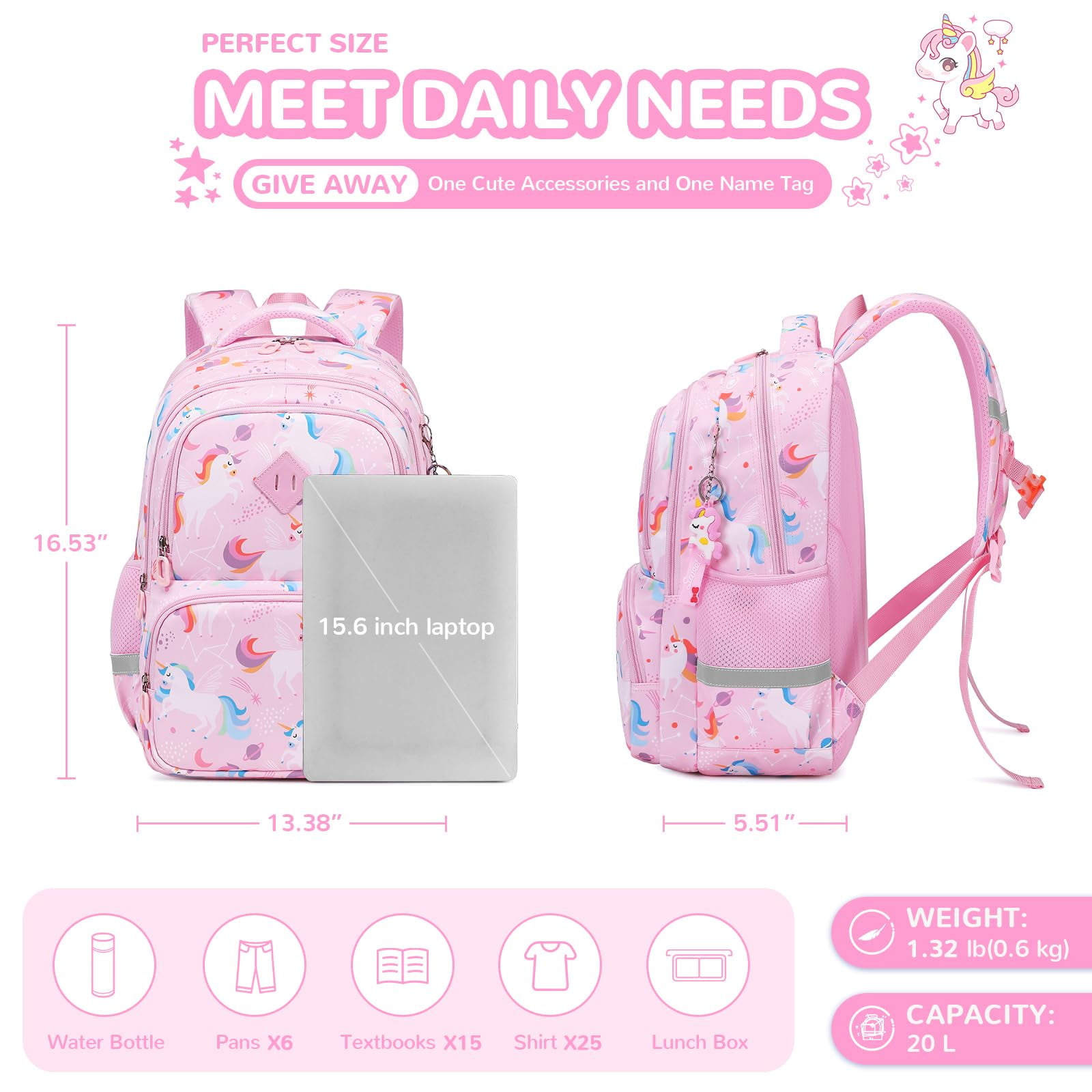 Aesthetically pleasing, the HD vivid printed patterns make this cute backpack a fashion statement. With dimensions of 16.53 inches in height, 13.38 inches in width, and 5.51 inches in depth, it provides ample space for books, stationery, and other essentials, making it one of the most practical book bags for girls available in the market.