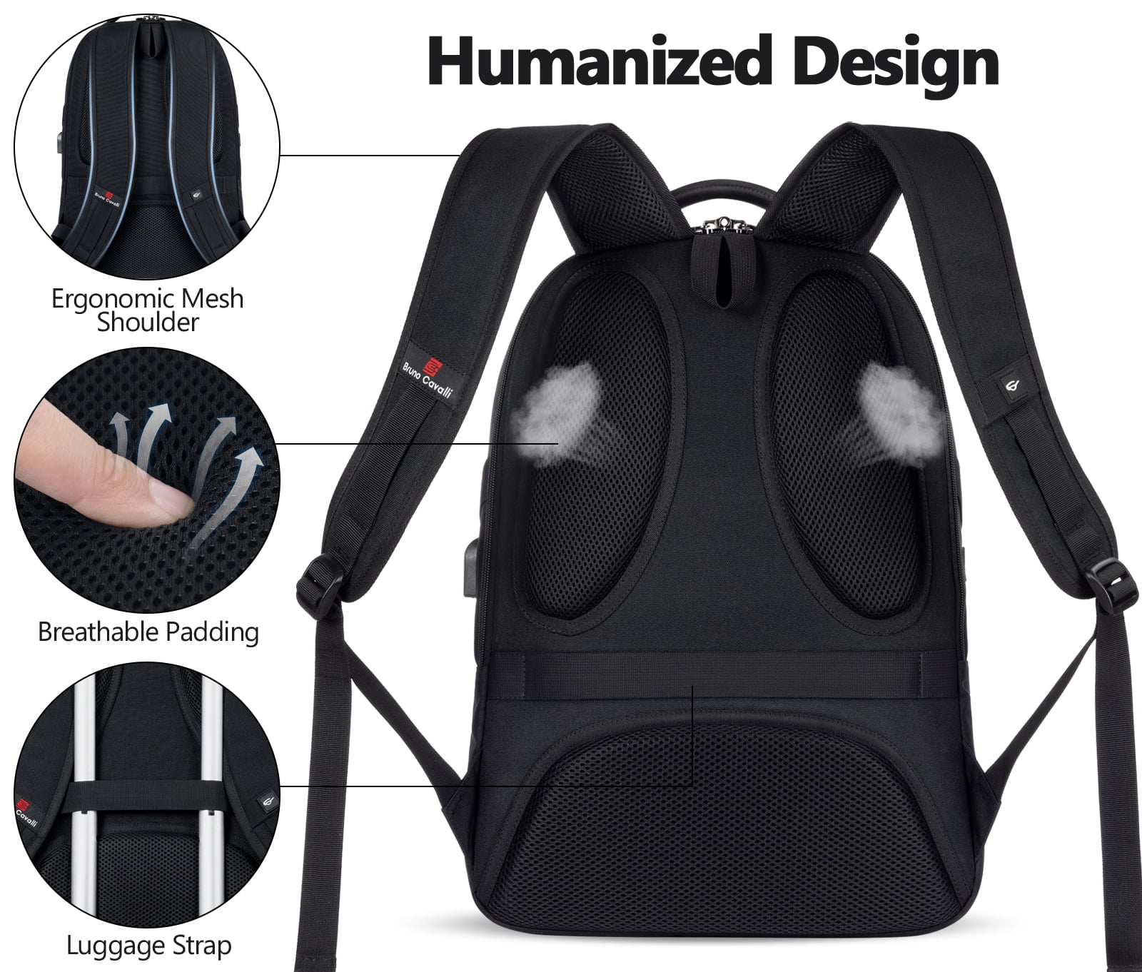【Comfortable & Ergonomic】Prioritizing comfort, our laptop backpack features a padded, breathable mesh back panel for ventilation and heat dissipation. Wide mesh shoulder straps with sponge pads reduce pressure, while reinforced padded top handles ensure easy carrying.